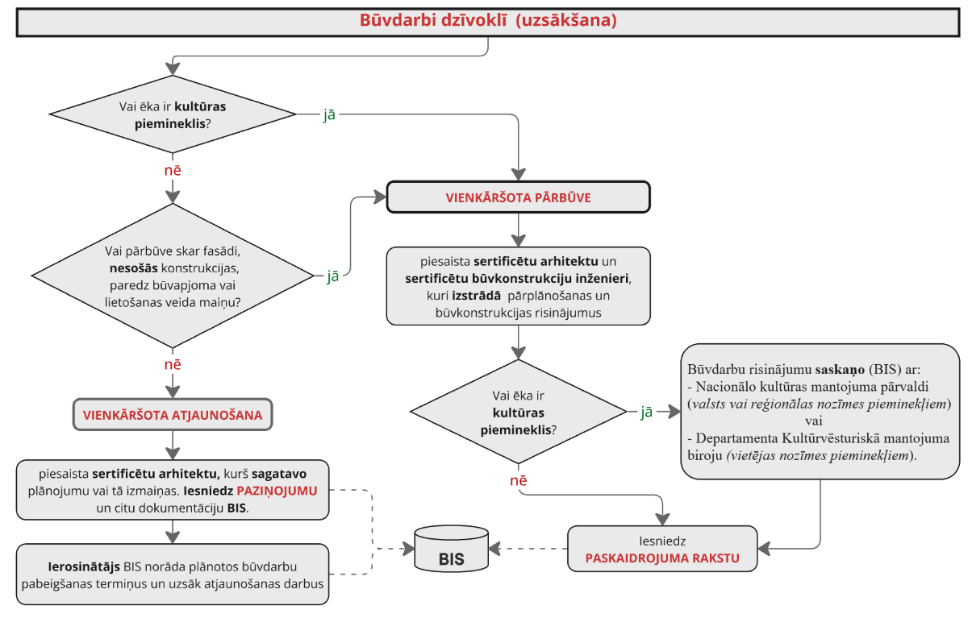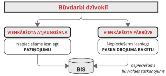 Vispirms jānosaka atbilstošais būvniecības veids un jāiesniedz attiecīga dokumentācija Būvniecības informācijas sistēmā (BIS).